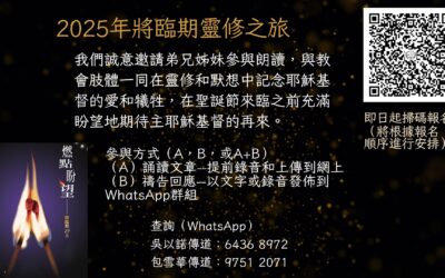 各位親愛的弟兄姊妹, 按照教會年曆的傳統,復活節主日往前推四十日(主日不算在内)的星期三稱為“聖灰星期三”(Ash Wednesday),從這日開始到復活節主日前,我們稱爲“大齋期”(又作“四旬期”或“預苦期”)。 今年大齋期從2月18日開始,教會選擇了靈命日糧事工製作的《40天與聖靈同行》,邀請弟兄姊妹透過朗讀、聆聽、回應的方式(每天5分鐘),一同記念並反思耶穌基督的受難與復活。 祈求引導使徒的聖靈,塑造我們每一位,成爲祂的器皿,使祂的教會成爲「 顛覆世界」、祝福世界的管道! 主題一:自...