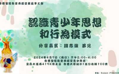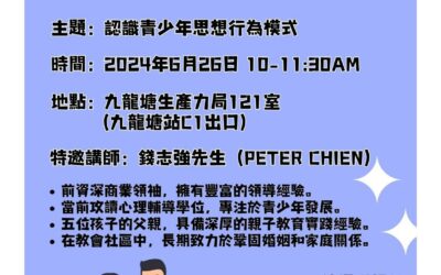 家庭事工部 系列家長講座之二: 孩子進入青春期之後的身心靈變化,時常讓父母感到疑惑和困擾。本來乖巧聽話的孩子,怎麼好像一夕之間變得暴躁或鬱悶?特邀請家裏有5個孩子的錢弟兄和大家聊聊“認識青少年思想和行為模式”。藉著科學研究、聖經啟示以及彼此經驗的分享,盼望能更認識我們的孩子,與他們建立親密信任的關係。 視頻重溫: http://files.hkmbc.org/events/20240407_Understanding_Teenage_Thoughts_and_Behaviors.mp4...