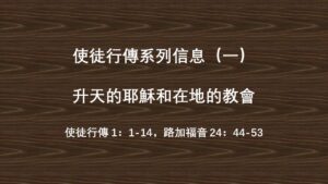 使徒行傳 1:1-14 1 提阿非羅啊,我已經作了前書,論到耶穌開頭一切所行所教訓的, 2 直到他藉着聖靈吩咐所揀選的使徒,以後被接上升的日子為止。 3 他受害之後,用許多的憑據將自己活活地顯給使徒看,四十天之久向他們顯現,講說神國的事。 4 耶穌和他們聚集的時候,囑咐他們說:「不要離開耶路撒冷,要等候父所應許的,就是你們聽見我說過的。 5 約翰是用水施洗,但不多幾日,你們要受聖靈的洗。」6 他們聚集的時候,問耶穌說:「主啊,你復興以色列國就在這時候嗎?」7 耶穌對他們說:「父憑着自己的權柄所定的時候、日期,不是你們可以知道的。 8 但聖靈降臨在你們身上,你們就必得着能力;並要在耶路撒冷、猶太全地和撒馬利亞,直到地極,作我的見證。」9 說了這話,他們正看的時候,他就被取上升,有一朵雲彩把他接去,便看不見他了。10 當他往上去,他們定睛望天的時候,忽然有兩個人身穿白衣,站在旁邊,說: 11 「加利利人哪,你們為甚麼站着望天呢?這離開你們被接升天的耶穌,你們見他怎樣往天上去,他還要怎樣來。」12 有一座山,名叫橄欖山,離耶路撒冷不遠,約有安息日可走的路程。當下,門徒從那裏回耶路撒冷去, 13 進了城,就上了所住的一間樓房。在那裏有彼得、約翰、雅各、安得烈、腓力、多馬、巴多羅買、馬太、亞勒腓的兒子雅各、奮銳黨的西門和雅各的兒子猶大。 14 這些人同着幾個婦人和耶穌的母親馬利亞,並耶穌的弟兄,都同心合意地恆切禱告。