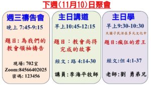 主內平安!  觀塘堂本周日主日崇拜的安排如下: