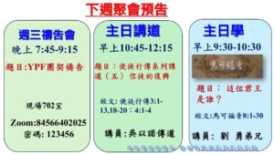 主內平安!  觀塘堂本周日主日崇拜的安排如下: