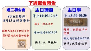主內平安!  觀塘堂本周日主日崇拜的安排如下: