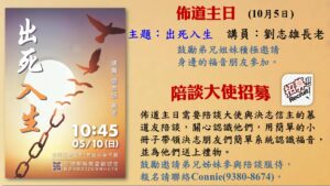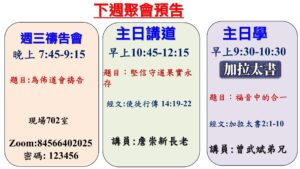 主內平安!  觀塘堂本周日主日崇拜的安排如下:
