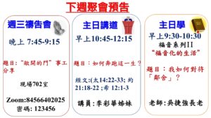 主內平安!  觀塘堂本周日主日崇拜的安排如下: