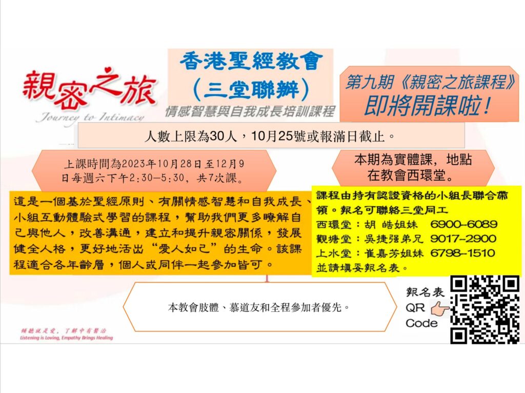 《親密之旅課程》—香港聖經教會(三堂联办)第九期的親密之旅課程即將開課啦!